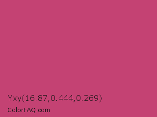 Yxy 16.87,0.444,0.269 Color is a normal rose color and the nearest color is Fuchsia Rose #c74375. Hex code #c44273 and RGB value is rgb(196,66,115). In RGB color space, this color is composed of 77% red, 26% green, 45% blue, In CMYK color space, this color is composed of 0% cyan, 66% magenta, 41% yellow , 23% black , In HSL color space, this color has a hue angle of 337° , 52% saturation and 51% lightness.