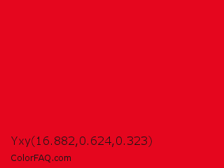 Yxy 16.882,0.624,0.323 Color is a normal red color and the nearest color is Cadmium Red #e30022. Hex code #e5061e and RGB value is rgb(229,6,30). In RGB color space, this color is composed of 90% red, 2% green, 12% blue, In CMYK color space, this color is composed of 0% cyan, 97% magenta, 87% yellow , 10% black , In HSL color space, this color has a hue angle of 354° , 95% saturation and 46% lightness.