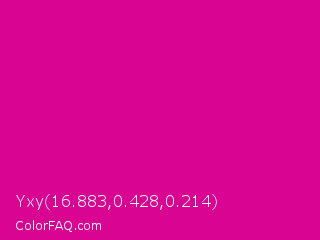 Yxy 16.883,0.428,0.214 Color is a normal magenta color and the nearest color is Mexican Pink #e4007c. Hex code #d90491 and RGB value is rgb(217,4,145). In RGB color space, this color is composed of 85% red, 2% green, 57% blue, In CMYK color space, this color is composed of 0% cyan, 98% magenta, 33% yellow , 15% black , In HSL color space, this color has a hue angle of 320° , 96% saturation and 43% lightness.