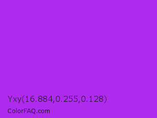 Yxy 16.884,0.255,0.128 Color is a normal purple color and the nearest color is Veronica #a020f0. Hex code #ae2bed and RGB value is rgb(174,43,237). In RGB color space, this color is composed of 68% red, 17% green, 93% blue, In CMYK color space, this color is composed of 27% cyan, 82% magenta, 0% yellow , 7% black , In HSL color space, this color has a hue angle of 281° , 84% saturation and 55% lightness.