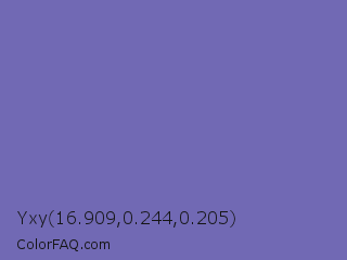 Yxy 16.909,0.244,0.205 Color is a normal indigo color and the nearest color is Toolbox #746cc0. Hex code #7169b4 and RGB value is rgb(113,105,180). In RGB color space, this color is composed of 44% red, 41% green, 71% blue, In CMYK color space, this color is composed of 37% cyan, 42% magenta, 0% yellow , 29% black , In HSL color space, this color has a hue angle of 246° , 33% saturation and 56% lightness.