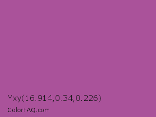 Yxy 16.914,0.34,0.226 Color is a normal magenta color and the nearest color is Purpureus #9a4eae. Hex code #aa529a and RGB value is rgb(170,82,154). In RGB color space, this color is composed of 67% red, 32% green, 60% blue, In CMYK color space, this color is composed of 0% cyan, 52% magenta, 9% yellow , 33% black , In HSL color space, this color has a hue angle of 311° , 35% saturation and 49% lightness.
