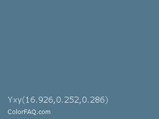 Yxy 16.926,0.252,0.286 Color is a normal blue color and the nearest color is Smalt Blue #51808f. Hex code #53778c and RGB value is rgb(83,119,140). In RGB color space, this color is composed of 33% red, 47% green, 55% blue, In CMYK color space, this color is composed of 41% cyan, 15% magenta, 0% yellow , 45% black , In HSL color space, this color has a hue angle of 202° , 26% saturation and 44% lightness.