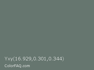 Yxy 16.929,0.301,0.344 Color is a normal green color and the nearest color is Nevada #646e75. Hex code #66766f and RGB value is rgb(102,118,111). In RGB color space, this color is composed of 40% red, 46% green, 44% blue, In CMYK color space, this color is composed of 14% cyan, 0% magenta, 6% yellow , 54% black , In HSL color space, this color has a hue angle of 154° , 7% saturation and 43% lightness.