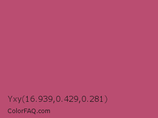 Yxy 16.939,0.429,0.281 Color is a normal rose color and the nearest color is Cadillac #b04c6a. Hex code #ba4d71 and RGB value is rgb(186,77,113). In RGB color space, this color is composed of 73% red, 30% green, 44% blue, In CMYK color space, this color is composed of 0% cyan, 59% magenta, 39% yellow , 27% black , In HSL color space, this color has a hue angle of 340° , 44% saturation and 52% lightness.