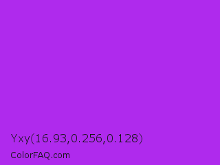 Yxy 16.93,0.256,0.128 Color is a normal purple color and the nearest color is Veronica #a020f0. Hex code #af2aed and RGB value is rgb(175,42,237). In RGB color space, this color is composed of 69% red, 16% green, 93% blue, In CMYK color space, this color is composed of 26% cyan, 82% magenta, 0% yellow , 7% black , In HSL color space, this color has a hue angle of 281° , 84% saturation and 55% lightness.