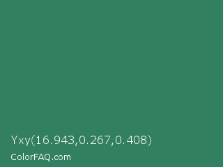 Yxy 16.943,0.267,0.408 Color is a normal green color and the nearest color is Amazon #3b7a57. Hex code #32805f and RGB value is rgb(50,128,95). In RGB color space, this color is composed of 20% red, 50% green, 37% blue, In CMYK color space, this color is composed of 61% cyan, 0% magenta, 26% yellow , 50% black , In HSL color space, this color has a hue angle of 155° , 44% saturation and 35% lightness.