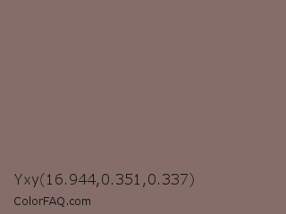 Yxy 16.944,0.351,0.337 Color is a normal red color and the nearest color is Sand Dune #826f65. Hex code #856d69 and RGB value is rgb(133,109,105). In RGB color space, this color is composed of 52% red, 43% green, 41% blue, In CMYK color space, this color is composed of 0% cyan, 18% magenta, 21% yellow , 48% black , In HSL color space, this color has a hue angle of 9° , 12% saturation and 47% lightness.