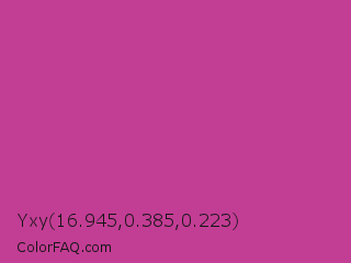 Yxy 16.945,0.385,0.223 Color is a normal magenta color and the nearest color is Smitten #c84186. Hex code #c23d94 and RGB value is rgb(194,61,148). In RGB color space, this color is composed of 76% red, 24% green, 58% blue, In CMYK color space, this color is composed of 0% cyan, 69% magenta, 24% yellow , 24% black , In HSL color space, this color has a hue angle of 321° , 52% saturation and 50% lightness.