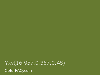 Yxy 16.957,0.367,0.48 Color is a normal lime color and the nearest color is Crete #737829. Hex code #667a30 and RGB value is rgb(102,122,48). In RGB color space, this color is composed of 40% red, 48% green, 19% blue, In CMYK color space, this color is composed of 16% cyan, 0% magenta, 61% yellow , 52% black , In HSL color space, this color has a hue angle of 76° , 44% saturation and 33% lightness.