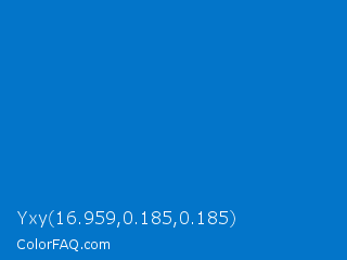Yxy 16.959,0.185,0.185 Color is a normal blue color and the nearest color is True Blue #0073cf. Hex code #0375c9 and RGB value is rgb(3,117,201). In RGB color space, this color is composed of 1% red, 46% green, 79% blue, In CMYK color space, this color is composed of 99% cyan, 42% magenta, 0% yellow , 21% black , In HSL color space, this color has a hue angle of 205° , 97% saturation and 40% lightness.