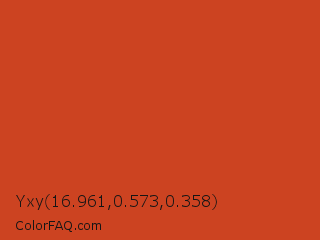 Yxy 16.961,0.573,0.358 Color is a normal red color and the nearest color is Dark Pastel Red #c23b22. Hex code #cc4321 and RGB value is rgb(204,67,33). In RGB color space, this color is composed of 80% red, 26% green, 13% blue, In CMYK color space, this color is composed of 0% cyan, 67% magenta, 84% yellow , 20% black , In HSL color space, this color has a hue angle of 12° , 72% saturation and 46% lightness.