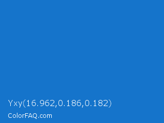 Yxy 16.962,0.186,0.182 Color is a normal blue color and the nearest color is Bright Navy Blue #1974d2. Hex code #1574cb and RGB value is rgb(21,116,203). In RGB color space, this color is composed of 8% red, 45% green, 80% blue, In CMYK color space, this color is composed of 90% cyan, 43% magenta, 0% yellow , 20% black , In HSL color space, this color has a hue angle of 209° , 81% saturation and 44% lightness.