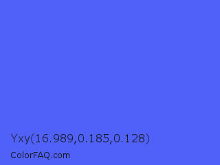 Yxy 16.989,0.185,0.128 Color is a light blue color and the nearest color is Ultramarine Blue #4166f5. Hex code #5061f9 and RGB value is rgb(80,97,249). In RGB color space, this color is composed of 31% red, 38% green, 98% blue, In CMYK color space, this color is composed of 68% cyan, 61% magenta, 0% yellow , 2% black , In HSL color space, this color has a hue angle of 234° , 93% saturation and 65% lightness.