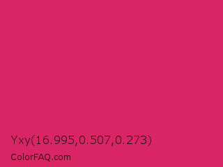 Yxy 16.995,0.507,0.273 Color is a normal rose color and the nearest color is Razzmatazz #e3256b. Hex code #d92564 and RGB value is rgb(217,37,100). In RGB color space, this color is composed of 85% red, 15% green, 39% blue, In CMYK color space, this color is composed of 0% cyan, 83% magenta, 54% yellow , 15% black , In HSL color space, this color has a hue angle of 339° , 71% saturation and 50% lightness.