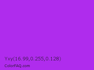 Yxy 16.99,0.255,0.128 Color is a normal purple color and the nearest color is Veronica #a020f0. Hex code #af2ced and RGB value is rgb(175,44,237). In RGB color space, this color is composed of 69% red, 17% green, 93% blue, In CMYK color space, this color is composed of 26% cyan, 81% magenta, 0% yellow , 7% black , In HSL color space, this color has a hue angle of 281° , 84% saturation and 55% lightness.
