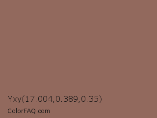 Yxy 17.004,0.389,0.35 Color is a normal red color and the nearest color is Beaver Crayola #926f5b. Hex code #92695d and RGB value is rgb(146,105,93). In RGB color space, this color is composed of 57% red, 41% green, 36% blue, In CMYK color space, this color is composed of 0% cyan, 28% magenta, 36% yellow , 43% black , In HSL color space, this color has a hue angle of 14° , 22% saturation and 47% lightness.