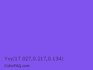 Yxy 17.027,0.217,0.134 Color is a light indigo color and the nearest color is Navy Purple #9457eb. Hex code #8153ee and RGB value is rgb(129,83,238). In RGB color space, this color is composed of 51% red, 33% green, 93% blue, In CMYK color space, this color is composed of 46% cyan, 65% magenta, 0% yellow , 7% black , In HSL color space, this color has a hue angle of 258° , 82% saturation and 63% lightness.