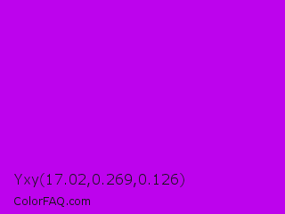 Yxy 17.02,0.269,0.126 Color is a normal purple color and the nearest color is Vivid Mulberry #b80ce3. Hex code #bd03ed and RGB value is rgb(189,3,237). In RGB color space, this color is composed of 74% red, 1% green, 93% blue, In CMYK color space, this color is composed of 20% cyan, 99% magenta, 0% yellow , 7% black , In HSL color space, this color has a hue angle of 288° , 98% saturation and 47% lightness.