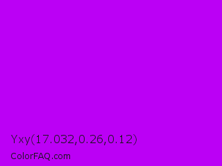 Yxy 17.032,0.26,0.12 Color is a normal purple color and the nearest color is Electric Purple #bf00ff. Hex code #bb00f5 and RGB value is rgb(187,0,245). In RGB color space, this color is composed of 73% red, 0% green, 96% blue, In CMYK color space, this color is composed of 24% cyan, 100% magenta, 0% yellow , 4% black , In HSL color space, this color has a hue angle of 286° , 100% saturation and 48% lightness.