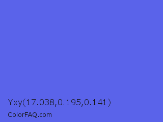 Yxy 17.038,0.195,0.141 Color is a light blue color and the nearest color is Majorelle Blue #6050dc. Hex code #5a63ea and RGB value is rgb(90,99,234). In RGB color space, this color is composed of 35% red, 39% green, 92% blue, In CMYK color space, this color is composed of 62% cyan, 58% magenta, 0% yellow , 8% black , In HSL color space, this color has a hue angle of 236° , 77% saturation and 64% lightness.