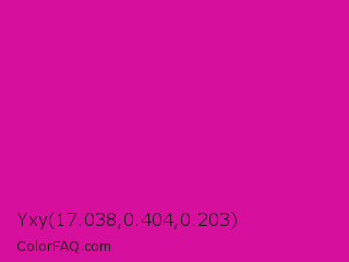 Yxy 17.038,0.404,0.203 Color is a normal magenta color and the nearest color is Barbie Pink #e0218a. Hex code #d60f9c and RGB value is rgb(214,15,156). In RGB color space, this color is composed of 84% red, 6% green, 61% blue, In CMYK color space, this color is composed of 0% cyan, 93% magenta, 27% yellow , 16% black , In HSL color space, this color has a hue angle of 317° , 87% saturation and 45% lightness.