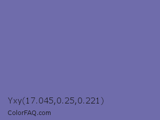 Yxy 17.045,0.25,0.221 Color is a normal indigo color and the nearest color is Deluge #7563a8. Hex code #6f6cab and RGB value is rgb(111,108,171). In RGB color space, this color is composed of 44% red, 42% green, 67% blue, In CMYK color space, this color is composed of 35% cyan, 37% magenta, 0% yellow , 33% black , In HSL color space, this color has a hue angle of 243° , 27% saturation and 55% lightness.