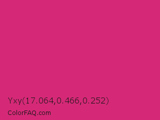 Yxy 17.064,0.466,0.252 Color is a normal rose color and the nearest color is Telemagenta #cf3476. Hex code #d52977 and RGB value is rgb(213,41,119). In RGB color space, this color is composed of 84% red, 16% green, 47% blue, In CMYK color space, this color is composed of 0% cyan, 81% magenta, 44% yellow , 16% black , In HSL color space, this color has a hue angle of 333° , 68% saturation and 50% lightness.