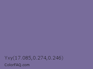 Yxy 17.085,0.274,0.246 Color is a normal indigo color and the nearest color is Kimberly #736c9f. Hex code #786c9b and RGB value is rgb(120,108,155). In RGB color space, this color is composed of 47% red, 42% green, 61% blue, In CMYK color space, this color is composed of 23% cyan, 30% magenta, 0% yellow , 39% black , In HSL color space, this color has a hue angle of 255° , 19% saturation and 52% lightness.