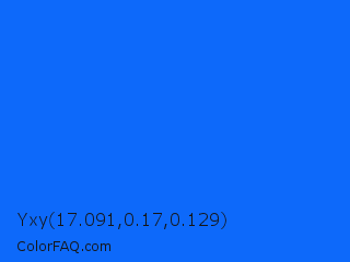 Yxy 17.091,0.17,0.129 Color is a normal blue color and the nearest color is Blue Ribbon #0066ff. Hex code #0d69fa and RGB value is rgb(13,105,250). In RGB color space, this color is composed of 5% red, 41% green, 98% blue, In CMYK color space, this color is composed of 95% cyan, 58% magenta, 0% yellow , 2% black , In HSL color space, this color has a hue angle of 217° , 96% saturation and 52% lightness.