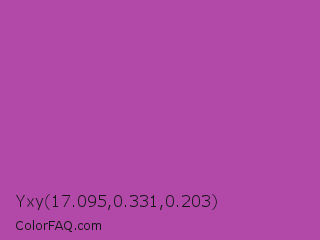 Yxy 17.095,0.331,0.203 Color is a normal magenta color and the nearest color is Purpureus #9a4eae. Hex code #b249a9 and RGB value is rgb(178,73,169). In RGB color space, this color is composed of 70% red, 29% green, 66% blue, In CMYK color space, this color is composed of 0% cyan, 59% magenta, 5% yellow , 30% black , In HSL color space, this color has a hue angle of 305° , 42% saturation and 49% lightness.