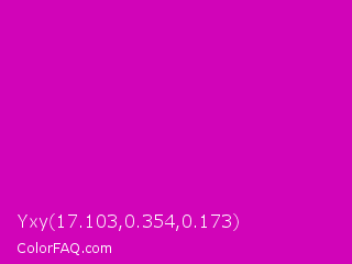 Yxy 17.103,0.354,0.173 Color is a normal magenta color and the nearest color is Deep Magenta #cc00cc. Hex code #d104b8 and RGB value is rgb(209,4,184). In RGB color space, this color is composed of 82% red, 2% green, 72% blue, In CMYK color space, this color is composed of 0% cyan, 98% magenta, 12% yellow , 18% black , In HSL color space, this color has a hue angle of 307° , 96% saturation and 42% lightness.