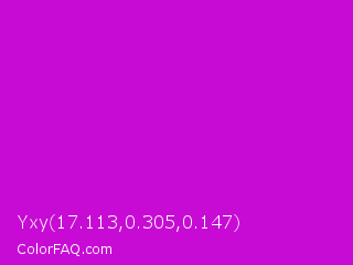 Yxy 17.113,0.305,0.147 Color is a normal magenta color and the nearest color is Deep Magenta #cc00cc. Hex code #c70bd4 and RGB value is rgb(199,11,212). In RGB color space, this color is composed of 78% red, 4% green, 83% blue, In CMYK color space, this color is composed of 6% cyan, 95% magenta, 0% yellow , 17% black , In HSL color space, this color has a hue angle of 296° , 90% saturation and 44% lightness.
