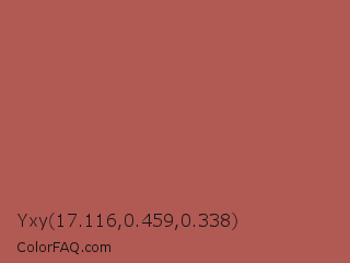 Yxy 17.116,0.459,0.338 Color is a normal red color and the nearest color is Giants Club #b05c52. Hex code #b15953 and RGB value is rgb(177,89,83). In RGB color space, this color is composed of 69% red, 35% green, 33% blue, In CMYK color space, this color is composed of 0% cyan, 50% magenta, 53% yellow , 31% black , In HSL color space, this color has a hue angle of 4° , 38% saturation and 51% lightness.