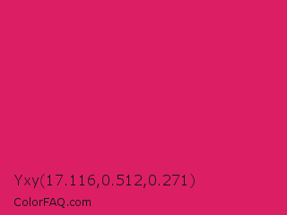 Yxy 17.116,0.512,0.271 Color is a normal rose color and the nearest color is Dogwood Rose #d71868. Hex code #dc1f64 and RGB value is rgb(220,31,100). In RGB color space, this color is composed of 86% red, 12% green, 39% blue, In CMYK color space, this color is composed of 0% cyan, 86% magenta, 55% yellow , 14% black , In HSL color space, this color has a hue angle of 338° , 75% saturation and 49% lightness.