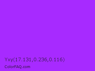 Yxy 17.131,0.236,0.116 Color is a normal purple color and the nearest color is Veronica #a020f0. Hex code #a72aff and RGB value is rgb(167,42,255). In RGB color space, this color is composed of 65% red, 16% green, 100% blue, In CMYK color space, this color is composed of 35% cyan, 84% magenta, 0% yellow , 0% black , In HSL color space, this color has a hue angle of 275° , 100% saturation and 58% lightness.