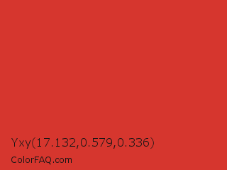 Yxy 17.132,0.579,0.336 Color is a normal red color and the nearest color is Persian Red #cc3333. Hex code #d6362e and RGB value is rgb(214,54,46). In RGB color space, this color is composed of 84% red, 21% green, 18% blue, In CMYK color space, this color is composed of 0% cyan, 75% magenta, 79% yellow , 16% black , In HSL color space, this color has a hue angle of 3° , 67% saturation and 51% lightness.