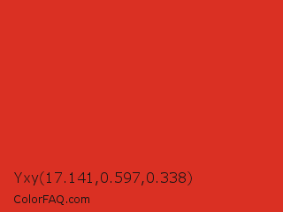 Yxy 17.141,0.597,0.338 Color is a normal red color and the nearest color is Vermilion #d9381e. Hex code #da3023 and RGB value is rgb(218,48,35). In RGB color space, this color is composed of 85% red, 19% green, 14% blue, In CMYK color space, this color is composed of 0% cyan, 78% magenta, 84% yellow , 15% black , In HSL color space, this color has a hue angle of 4° , 72% saturation and 50% lightness.