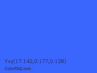 Yxy 17.142,0.177,0.128 Color is a normal blue color and the nearest color is Ultramarine Blue #4166f5. Hex code #3965fb and RGB value is rgb(57,101,251). In RGB color space, this color is composed of 22% red, 40% green, 98% blue, In CMYK color space, this color is composed of 77% cyan, 60% magenta, 0% yellow , 2% black , In HSL color space, this color has a hue angle of 226° , 96% saturation and 60% lightness.