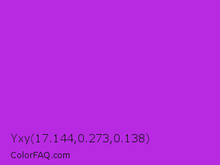 Yxy 17.144,0.273,0.138 Color is a normal purple color and the nearest color is Veronica #a020f0. Hex code #b72ae2 and RGB value is rgb(183,42,226). In RGB color space, this color is composed of 72% red, 16% green, 89% blue, In CMYK color space, this color is composed of 19% cyan, 81% magenta, 0% yellow , 11% black , In HSL color space, this color has a hue angle of 286° , 76% saturation and 53% lightness.
