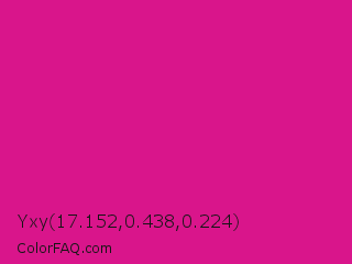Yxy 17.152,0.438,0.224 Color is a normal magenta color and the nearest color is Vivid Cerise #da1d81. Hex code #d9158b and RGB value is rgb(217,21,139). In RGB color space, this color is composed of 85% red, 8% green, 55% blue, In CMYK color space, this color is composed of 0% cyan, 90% magenta, 36% yellow , 15% black , In HSL color space, this color has a hue angle of 324° , 82% saturation and 47% lightness.