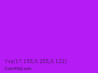 Yxy 17.155,0.255,0.122 Color is a normal purple color and the nearest color is Veronica #a020f0. Hex code #b51bf5 and RGB value is rgb(181,27,245). In RGB color space, this color is composed of 71% red, 11% green, 96% blue, In CMYK color space, this color is composed of 26% cyan, 89% magenta, 0% yellow , 4% black , In HSL color space, this color has a hue angle of 282° , 92% saturation and 53% lightness.