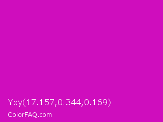 Yxy 17.157,0.344,0.169 Color is a normal magenta color and the nearest color is Deep Magenta #cc00cc. Hex code #cf0dbd and RGB value is rgb(207,13,189). In RGB color space, this color is composed of 81% red, 5% green, 74% blue, In CMYK color space, this color is composed of 0% cyan, 94% magenta, 9% yellow , 19% black , In HSL color space, this color has a hue angle of 306° , 88% saturation and 43% lightness.
