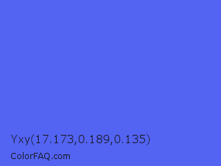 Yxy 17.173,0.189,0.135 Color is a light blue color and the nearest color is Ultramarine Blue #4166f5. Hex code #5363f2 and RGB value is rgb(83,99,242). In RGB color space, this color is composed of 33% red, 39% green, 95% blue, In CMYK color space, this color is composed of 66% cyan, 59% magenta, 0% yellow , 5% black , In HSL color space, this color has a hue angle of 234° , 86% saturation and 64% lightness.