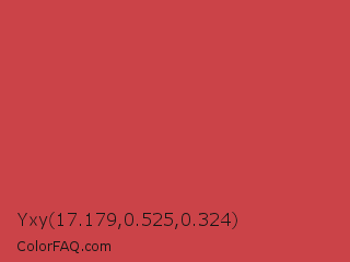 Yxy 17.179,0.525,0.324 Color is a normal red color and the nearest color is English Vermillion #cc474b. Hex code #cb4348 and RGB value is rgb(203,67,72). In RGB color space, this color is composed of 80% red, 26% green, 28% blue, In CMYK color space, this color is composed of 0% cyan, 67% magenta, 65% yellow , 20% black , In HSL color space, this color has a hue angle of 358° , 57% saturation and 53% lightness.