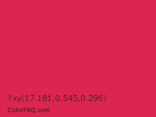 Yxy 17.181,0.545,0.296 Color is a normal red color and the nearest color is Amaranth #e52b50. Hex code #dc2650 and RGB value is rgb(220,38,80). In RGB color space, this color is composed of 86% red, 15% green, 31% blue, In CMYK color space, this color is composed of 0% cyan, 83% magenta, 64% yellow , 14% black , In HSL color space, this color has a hue angle of 346° , 72% saturation and 51% lightness.