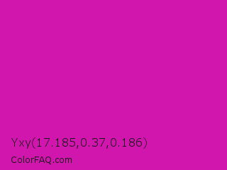 Yxy 17.185,0.37,0.186 Color is a normal magenta color and the nearest color is Royal Fuchsia #ca2c92. Hex code #d116ad and RGB value is rgb(209,22,173). In RGB color space, this color is composed of 82% red, 9% green, 68% blue, In CMYK color space, this color is composed of 0% cyan, 89% magenta, 17% yellow , 18% black , In HSL color space, this color has a hue angle of 312° , 81% saturation and 45% lightness.