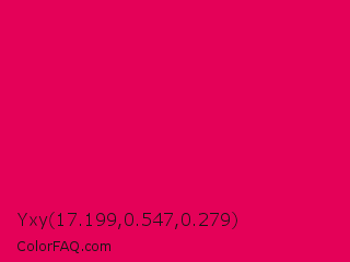 Yxy 17.199,0.547,0.279 Color is a normal rose color and the nearest color is Razzmatazz Crayola #e30b5c. Hex code #e40158 and RGB value is rgb(228,1,88). In RGB color space, this color is composed of 89% red, 0% green, 35% blue, In CMYK color space, this color is composed of 0% cyan, 100% magenta, 61% yellow , 11% black , In HSL color space, this color has a hue angle of 337° , 99% saturation and 45% lightness.
