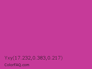Yxy 17.232,0.383,0.217 Color is a normal magenta color and the nearest color is Byzantine #bd33a4. Hex code #c63a99 and RGB value is rgb(198,58,153). In RGB color space, this color is composed of 78% red, 23% green, 60% blue, In CMYK color space, this color is composed of 0% cyan, 71% magenta, 23% yellow , 22% black , In HSL color space, this color has a hue angle of 319° , 55% saturation and 50% lightness.