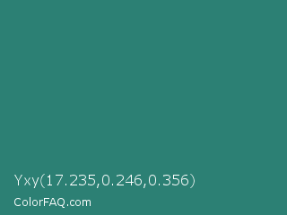 Yxy 17.235,0.246,0.356 Color is a normal cyan color and the nearest color is Celadon Green #2f847c. Hex code #2c8074 and RGB value is rgb(44,128,116). In RGB color space, this color is composed of 17% red, 50% green, 45% blue, In CMYK color space, this color is composed of 66% cyan, 0% magenta, 9% yellow , 50% black , In HSL color space, this color has a hue angle of 171° , 49% saturation and 34% lightness.